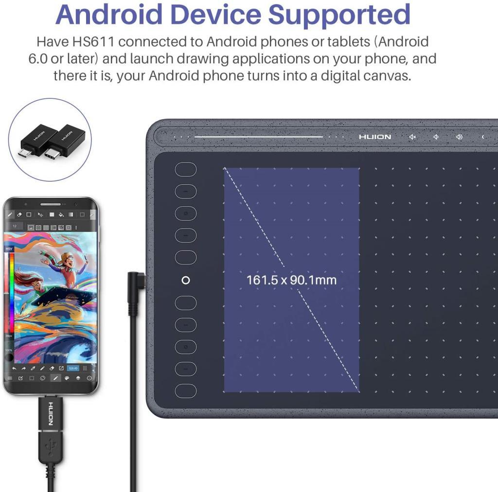 • Sadece Windows işletim sistemi ve Mac OS için değil, aynı zamanda Android ile uyumlu 6.0 veya daha sonra, Huion HS611 çizim tablet bir adaptör üzerinden android telefonlar veya tabletler ile bağlı olabilir. Bilgisayar kullanılamadığında, ilhamınızı kaydetmek için herhangi bir yere götürebilirsiniz. Kesinlikle iş hareketliliğini ve rahatlığını artırır.