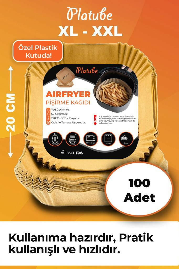 · Tüm Markalara Uyumlu Büyük Boy XL-XXL Fritöz PişirmeKağıdı - Air Fryer Liners Hava Fritözü Kare Model Bu önceden kesilmiş kare tabak model pişirme kağıdı, yiyecek artıklarının yapışmasını önler, yağa dayanıklı, her iki tarafı da yapışmaz, temizlenmesi kolaydır. Pişirdikten sonra temizlik yapmaktan nefret ediyorsanız, bunlar mutfağın olmazsa olmazlarıdır.