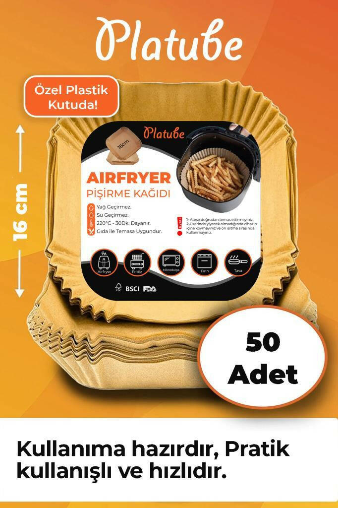 •           Tüm Markalara Uyumlu Fritöz PişirmeKağıdı - Air Fryer Liners Hava Fritözü Kare Model Bu önceden kesilmiş kare tabak model pişirme kağıdı, yiyecek artıklarının yapışmasını önler, yağa dayanıklı, her iki tarafı da yapışmaz, temizlenmesi kolaydır. Pişirdikten sonra temizlik yapmaktan nefret ediyorsanız, bunlar mutfağın olmazsa olmazlarıdır.
