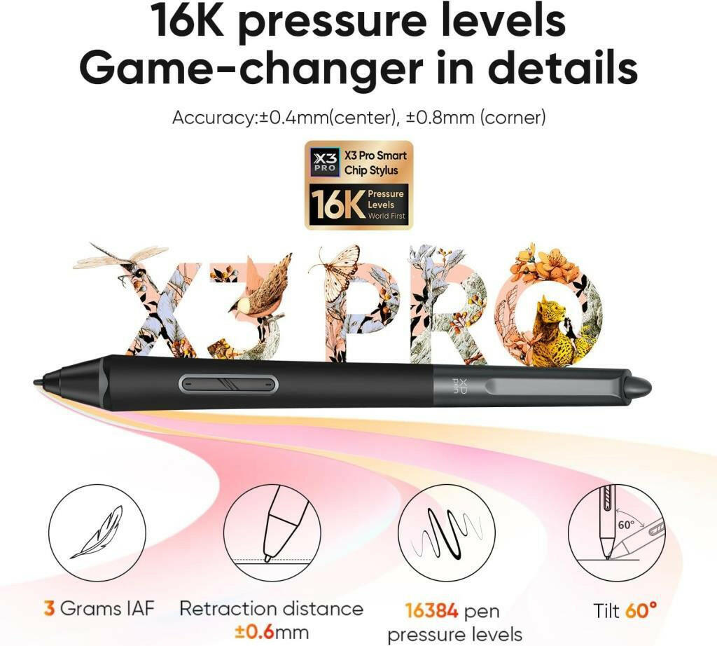 -16K Basınç Hassasiyeti: XPPen Artist Pro 16 Gen2 çizim tableti, X3 Pro akıllı çipli stylus ile birlikte sektörde bir ilk olan 16K basınç seviyesini sunarak, rakiplerinin %100* daha yüksek bir basınç seviyesine sahip. Artık hiç olmadığı kadar keskin ve düzgün çizgiler sunar, ayrıntılarda çığır açıcı bir değişimdir.