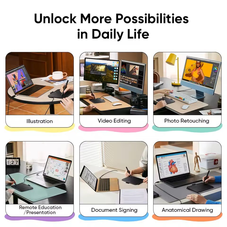XP-Pen Deco 640 yalnızca dijital sanat için değil, günlük yaşamda da yanınızda olacak bir yardımcıdır. Sınıfta not almak, belgeleri imzalamak veya hareket halindeyken eskiz çizmek için ideal olan ince ve hafif yapısıyla öne çıkar. Photoshop, Illustrator ve Onenote gibi birçok popüler yazılımla uyumlu olması, hem profesyonel hem de eğitim ortamlarında değerli bir araç olmasını sağlar. 10 yedek uçla birlikte gelen bu dayanıklı tablet, günlük kullanımın getireceği zorluklara da dayanıklıdır – böylece yaratıcılığınız hiç kesintiye uğramaz.