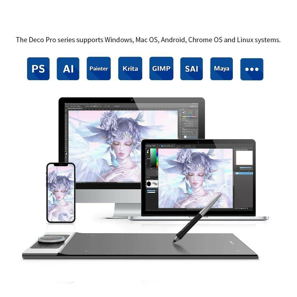 Deco Pro serisi, Windows, Mac OS, Android, Chrome OS ve Linux sistemlerini destekler. Photoshop, SAI, Painter, Illustrator ve daha fazlası dahil olmak üzere çoğu çizim ve tasarım yazılımı ile uyumludur.